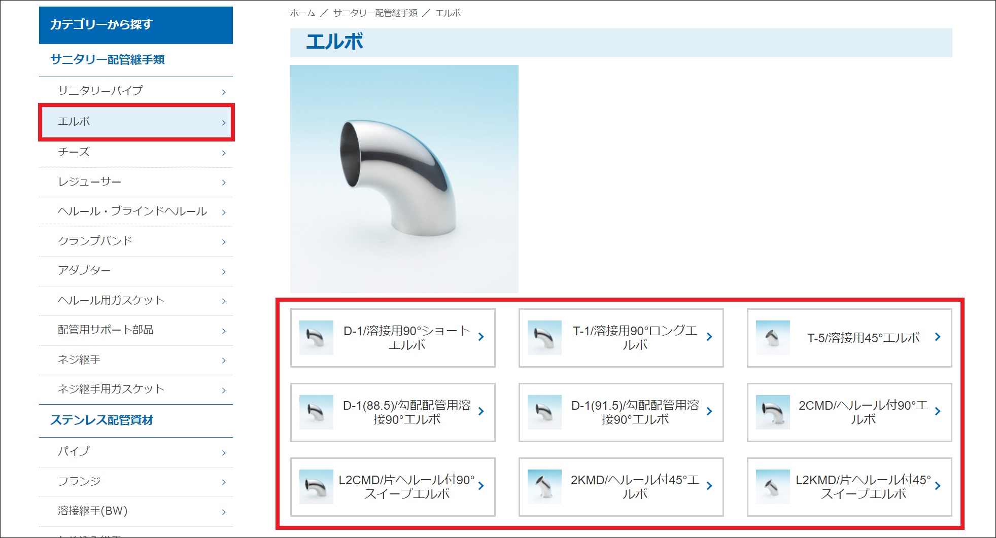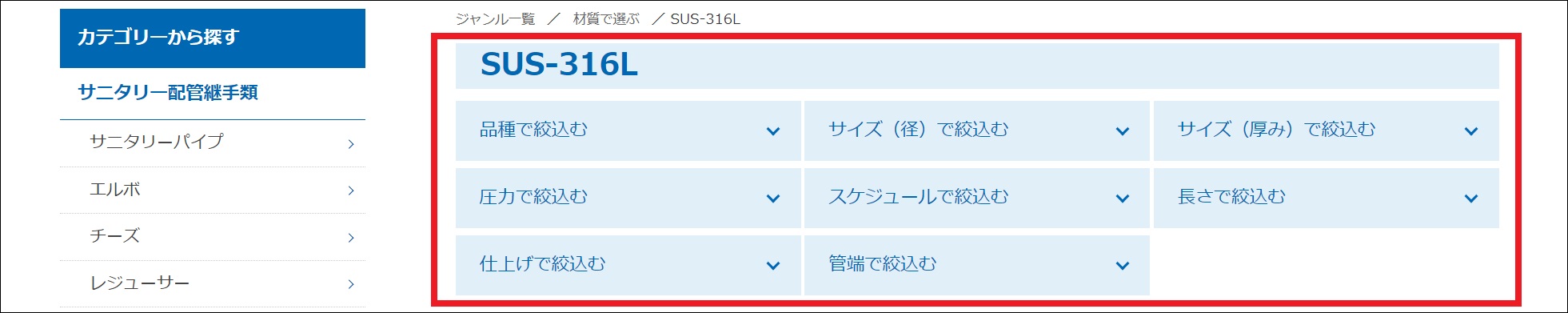 トップページの左側のカテゴリー一覧より、お探しの商品カテゴリーを選択し、商品名一覧>材質の順で絞り込みを行います。